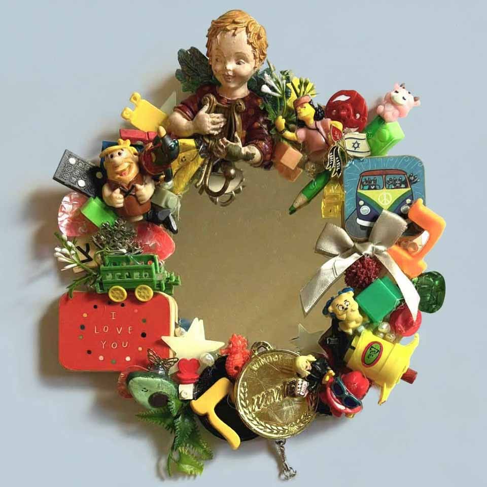 המראה מוכנה כשמסביבה המוני צעצועים מודבקים בצפיפות ומכסים את פני משטח העץ.
